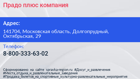 Прадо плюс, компания по адресу 141704, Московская область, Долгопрудный, Октябрьская, 29 в дальнейшем Организация, размещена в следующих категориях: