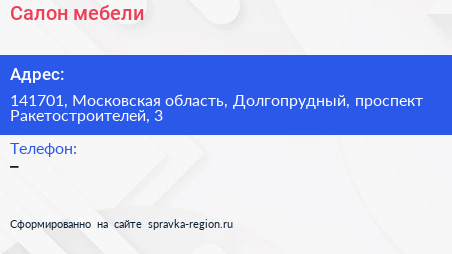 Салон мебели по адресу 141701, Московская область, Долгопрудный, проспект Ракетостроителей, 3 в дальнейшем Организация, размещена в следующих категориях: