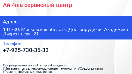 Ай!4nia, сервисный центр по адресу 141700, Московская область, Долгопрудный, Академика Лаврентьева, 21 в дальнейшем Организация, размещена в следующих категориях: