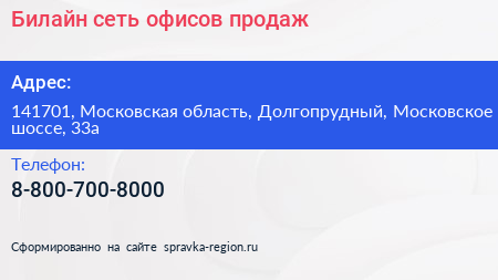 Билайн, сеть офисов продаж по адресу 141701, Московская область, Долгопрудный, Московское шоссе, 33а в дальнейшем Организация, размещена в следующих категориях: