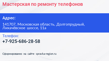 Мастерская по ремонту телефонов по адресу 141707, Московская область, Долгопрудный, Лихачёвское шоссе, 11а в дальнейшем Организация, размещена в следующих категориях: