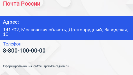 Почта России по адресу 141702, Московская область, Долгопрудный, Заводская, 10 в дальнейшем Организация, размещена в следующих категориях: