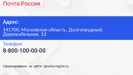 Почта России по адресу 141700, Московская область, Долгопрудный, Дирижабельная, 13 в дальнейшем Организация, размещена в следующих категориях: