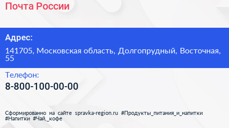 Почта России по адресу 141705, Московская область, Долгопрудный, Восточная, 55 в дальнейшем Организация, размещена в следующих категориях:
