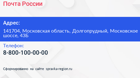 Почта России по адресу 141704, Московская область, Долгопрудный, Московское шоссе, 43Б в дальнейшем Организация, размещена в следующих категориях: