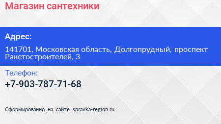 Магазин сантехники по адресу 141701, Московская область, Долгопрудный, проспект Ракетостроителей, 3 в дальнейшем Организация, размещена в следующих категориях: