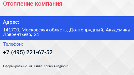 Отопление, компания по адресу 141700, Московская область, Долгопрудный, Академика Лаврентьева, 21 в дальнейшем Организация, размещена в следующих категориях: