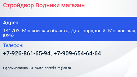 Стройдвор Водники, магазин по адресу 141703, Московская область, Долгопрудный, Московская, вл46 в дальнейшем Организация, размещена в следующих категориях: