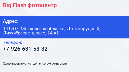 Big Flash, фотоцентр по адресу 141707, Московская область, Долгопрудный, Лихачёвское шоссе, 14 к1 в дальнейшем Организация, размещена в следующих категориях: