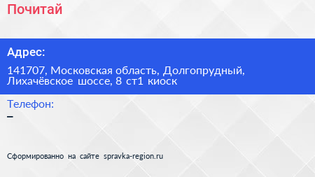 Почитай по адресу 141707, Московская область, Долгопрудный, Лихачёвское шоссе, 8 ст1 киоск в дальнейшем Организация, размещена в следующих категориях: