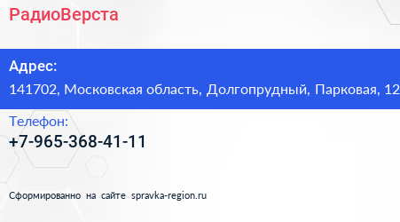РадиоВерста по адресу 141702, Московская область, Долгопрудный, Парковая, 12 в дальнейшем Организация, размещена в следующих категориях: