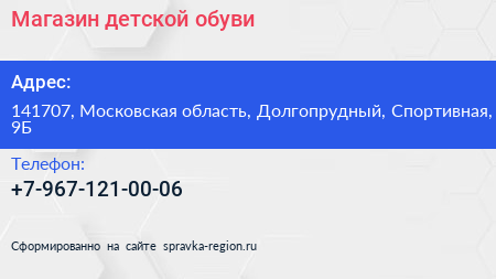 Магазин детской обуви по адресу 141707, Московская область, Долгопрудный, Спортивная, 9Б в дальнейшем Организация, размещена в следующих категориях: