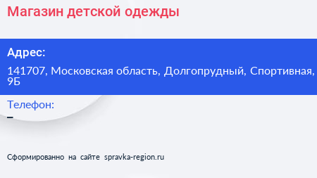 Магазин детской одежды по адресу 141707, Московская область, Долгопрудный, Спортивная, 9Б в дальнейшем Организация, размещена в следующих категориях: