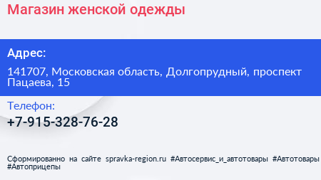Магазин женской одежды по адресу 141707, Московская область, Долгопрудный, проспект Пацаева, 15 в дальнейшем Организация, размещена в следующих категориях: