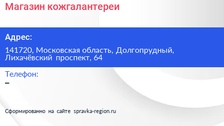 Магазин кожгалантереи по адресу 141720, Московская область, Долгопрудный, Лихачёвский проспект, 64 в дальнейшем Организация, размещена в следующих категориях: