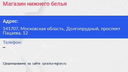 Магазин нижнего белья по адресу 141707, Московская область, Долгопрудный, проспект Пацаева, 12 в дальнейшем Организация, размещена в следующих категориях: