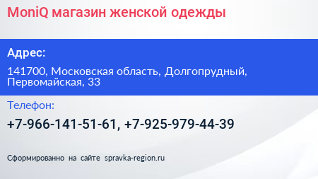 MoniQ, магазин женской одежды по адресу 141700, Московская область, Долгопрудный, Первомайская, 33 в дальнейшем Организация, размещена в следующих категориях: