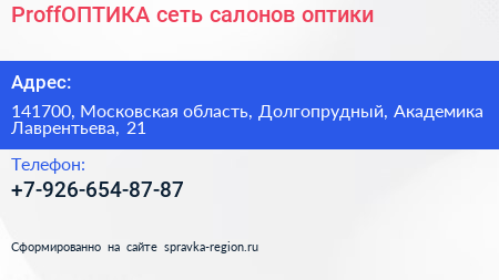ProffОПТИКА, сеть салонов оптики по адресу 141700, Московская область, Долгопрудный, Академика Лаврентьева, 21 в дальнейшем Организация, размещена в следующих категориях: