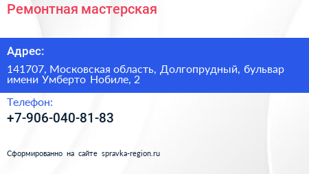 Ремонтная мастерская по адресу 141707, Московская область, Долгопрудный, бульвар имени Умберто Нобиле, 2 в дальнейшем Организация, размещена в следующих категориях: