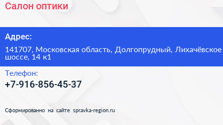 Салон оптики по адресу 141707, Московская область, Долгопрудный, Лихачёвское шоссе, 14 к1 в дальнейшем Организация, размещена в следующих категориях: