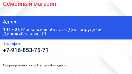 Семейный, магазин по адресу 141700, Московская область, Долгопрудный, Дирижабельная, 13 в дальнейшем Организация, размещена в следующих категориях:
