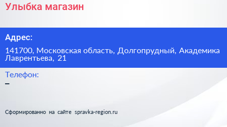 Улыбка, магазин по адресу 141700, Московская область, Долгопрудный, Академика Лаврентьева, 21 в дальнейшем Организация, размещена в следующих категориях: