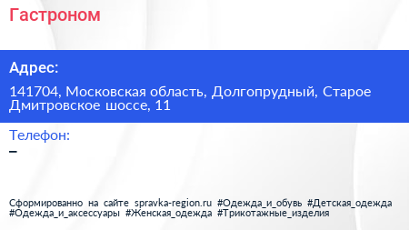 Гастроном по адресу 141704, Московская область, Долгопрудный, Старое Дмитровское шоссе, 11 в дальнейшем Организация, размещена в следующих категориях: