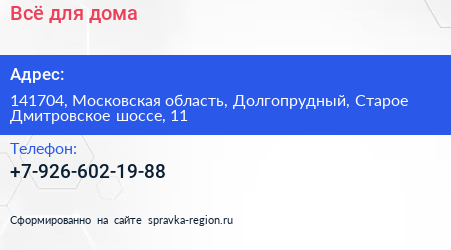 Всё для дома по адресу 141704, Московская область, Долгопрудный, Старое Дмитровское шоссе, 11 в дальнейшем Организация, размещена в следующих категориях: