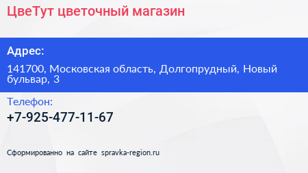 ЦвеТут, цветочный магазин по адресу 141700, Московская область, Долгопрудный, Новый бульвар, 3 в дальнейшем Организация, размещена в следующих категориях: