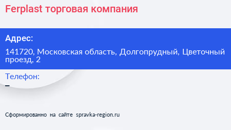 Ferplast, торговая компания по адресу 141720, Московская область, Долгопрудный, Цветочный проезд, 2 в дальнейшем Организация, размещена в следующих категориях: