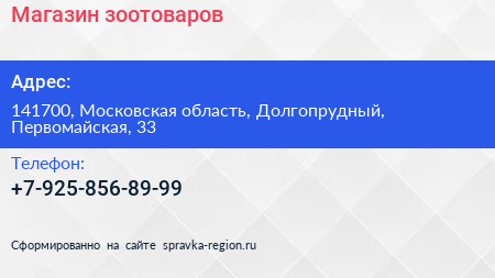 Магазин зоотоваров по адресу 141700, Московская область, Долгопрудный, Первомайская, 33 в дальнейшем Организация, размещена в следующих категориях: