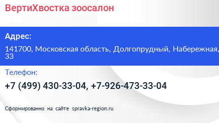 ВертиХвостка, зоосалон по адресу 141700, Московская область, Долгопрудный, Набережная, 33 в дальнейшем Организация, размещена в следующих категориях:
