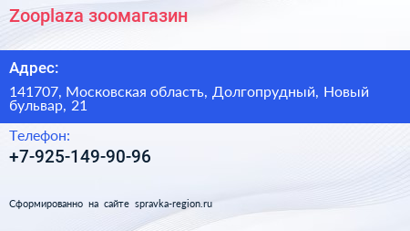 Zooplaza, зоомагазин по адресу 141707, Московская область, Долгопрудный, Новый бульвар, 21 в дальнейшем Организация, размещена в следующих категориях: