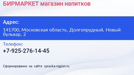 БИРМАРКЕТ, магазин напитков по адресу 141700, Московская область, Долгопрудный, Новый бульвар, 2 в дальнейшем Организация, размещена в следующих категориях: