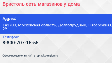 Бристоль, сеть магазинов у дома по адресу 141700, Московская область, Долгопрудный, Набережная, 29 в дальнейшем Организация, размещена в следующих категориях: