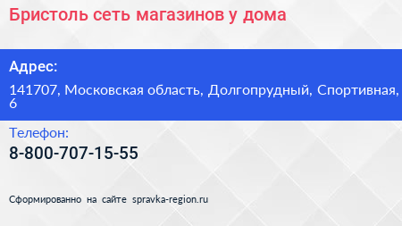 Бристоль, сеть магазинов у дома по адресу 141707, Московская область, Долгопрудный, Спортивная, 6 в дальнейшем Организация, размещена в следующих категориях: