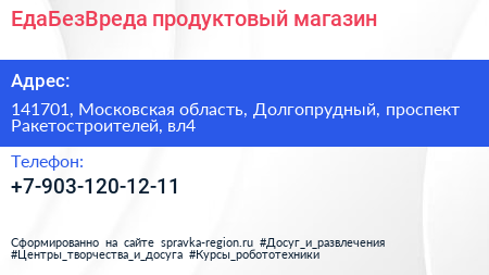 ЕдаБезВреда, продуктовый магазин по адресу 141701, Московская область, Долгопрудный, проспект Ракетостроителей, вл4 в дальнейшем Организация, размещена в следующих категориях: