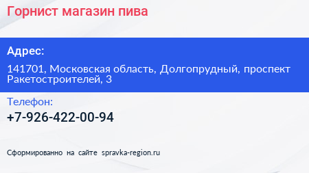 Горнист, магазин пива по адресу 141701, Московская область, Долгопрудный, проспект Ракетостроителей, 3 в дальнейшем Организация, размещена в следующих категориях: