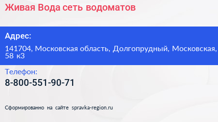 Живая Вода, сеть водоматов по адресу 141704, Московская область, Долгопрудный, Московская, 58 к3 в дальнейшем Организация, размещена в следующих категориях: