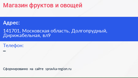 Магазин фруктов и овощей по адресу 141701, Московская область, Долгопрудный, Дирижабельная, вл9 в дальнейшем Организация, размещена в следующих категориях: