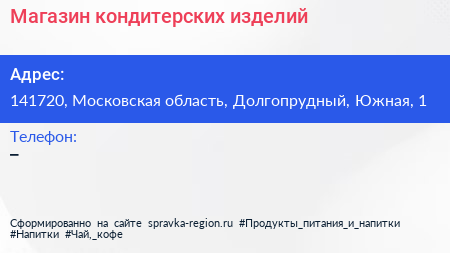 Магазин кондитерских изделий по адресу 141720, Московская область, Долгопрудный, Южная, 1 в дальнейшем Организация, размещена в следующих категориях: