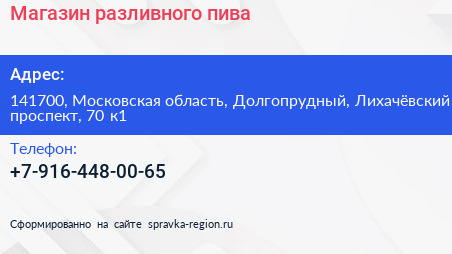 Магазин разливного пива по адресу 141700, Московская область, Долгопрудный, Лихачёвский проспект, 70 к1 в дальнейшем Организация, размещена в следующих категориях: