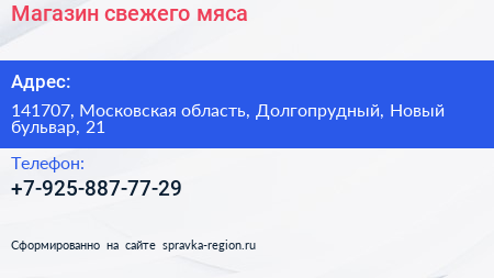 Магазин свежего мяса по адресу 141707, Московская область, Долгопрудный, Новый бульвар, 21 в дальнейшем Организация, размещена в следующих категориях: