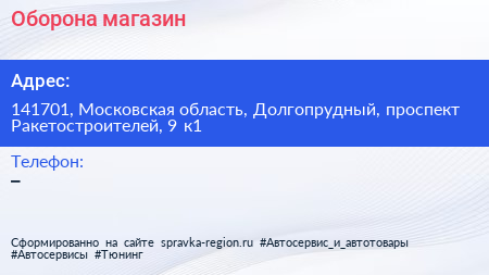 Оборона, магазин по адресу 141701, Московская область, Долгопрудный, проспект Ракетостроителей, 9 к1 в дальнейшем Организация, размещена в следующих категориях: