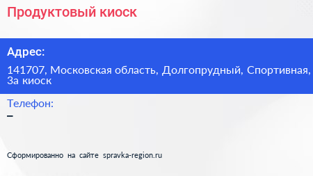 Продуктовый киоск по адресу 141707, Московская область, Долгопрудный, Спортивная, 3а киоск в дальнейшем Организация, размещена в следующих категориях: