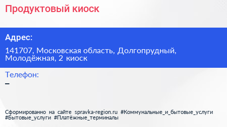 Продуктовый киоск по адресу 141707, Московская область, Долгопрудный, Молодёжная, 2 киоск в дальнейшем Организация, размещена в следующих категориях: