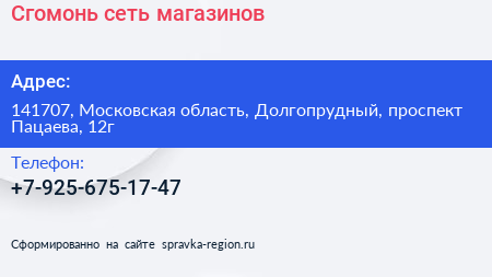 Сгомонь, сеть магазинов по адресу 141707, Московская область, Долгопрудный, проспект Пацаева, 12г в дальнейшем Организация, размещена в следующих категориях: