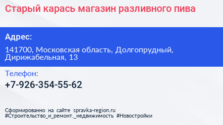 Старый карась, магазин разливного пива по адресу 141700, Московская область, Долгопрудный, Дирижабельная, 13 в дальнейшем Организация, размещена в следующих категориях:
