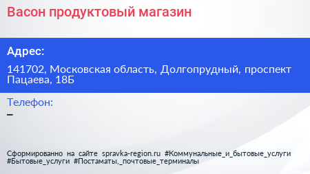 Васон, продуктовый магазин по адресу 141702, Московская область, Долгопрудный, проспект Пацаева, 18Б в дальнейшем Организация, размещена в следующих категориях: