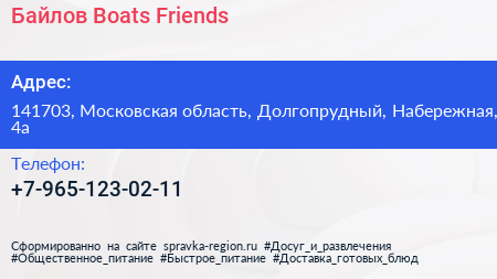 Байлов Boats & Friends по адресу 141703, Московская область, Долгопрудный, Набережная, 4а в дальнейшем Организация, размещена в следующих категориях: